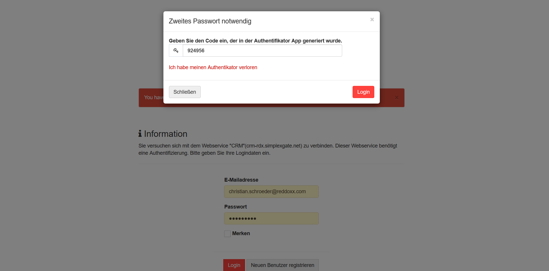 Unsere Mitarbeiter kennen die URLs (in diesem Beispiel https://crm.reddoxx.com) der einzelnen Anwendungen und greifen nun direkt über den Browser darauf zu. Bevor der Mitarbeiter beim eigentlich Dienst „ankommt“, muss er sich allerdings zunächst an der SimplexGate Cloud authentifizieren. In diesem Beispiel sogar inklusive einem zweiten Faktor, der auf dem Smartphone des Mitarbeiters generiert wird.