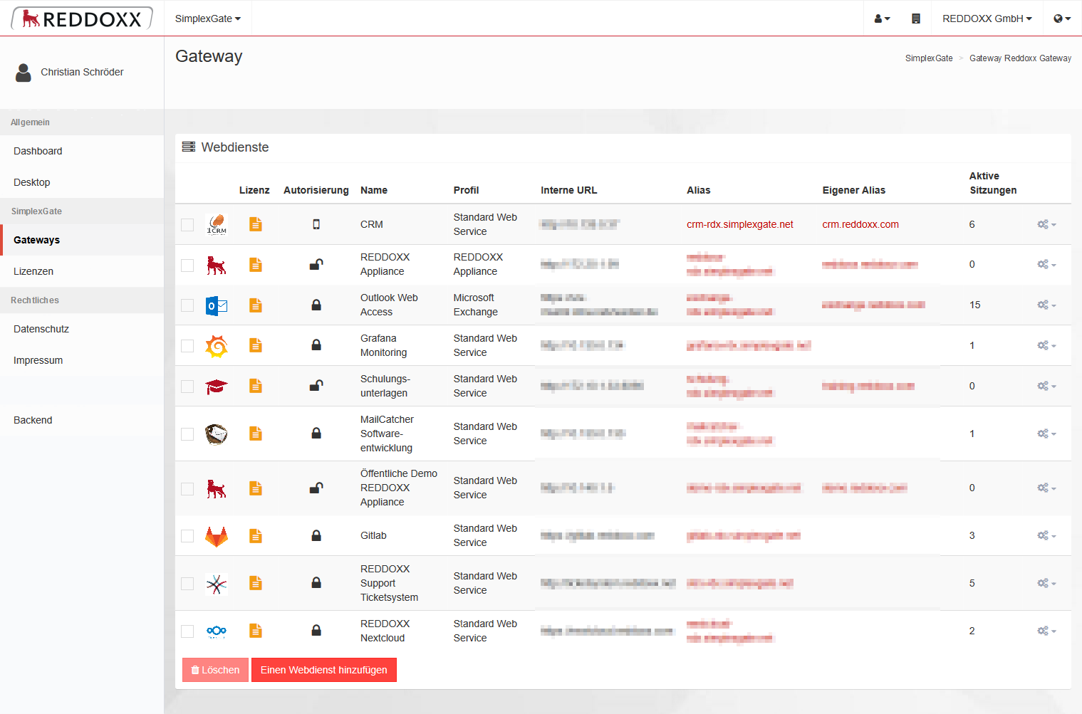 In der Verwaltung innerhalb der SimplexGate Cloud sehen Sie alle eingerichteten Webservices in der Übersicht. Hier können auf Wunsch eigene URLs und individuelle Zugriffsberechtigungen eingerichtet werden.